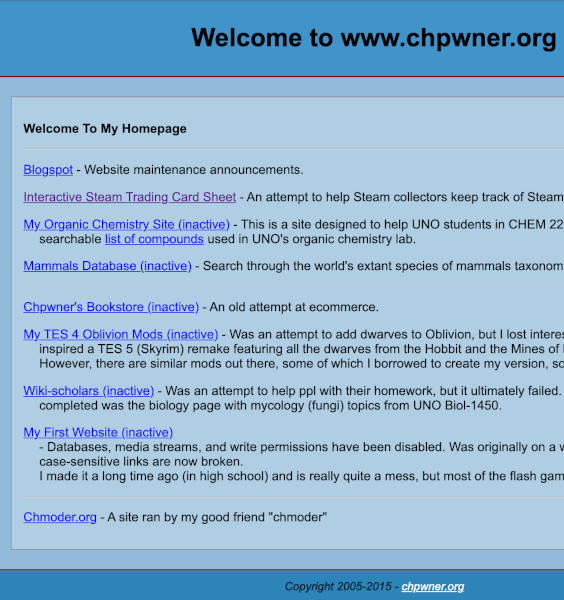 Chpwner.org went online in 2008 (though I used a shared public domain from 2005 through 2007) and up until 2020 it ran as a portfolio-of-sorts, accumulating all of my web-based experiments. Most of the projects were no more than fragments as I learned web coding (HTML, CSS, PHP, Perl, and JS). More on my history pages, but learning web server administration was the driving factor behind learning web coding. Though I used to have a homebrew webserver hosting my content, that is no longer the case today.